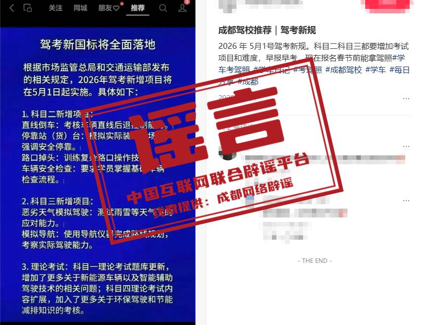 詳情:近日,有網(wǎng)傳消息稱,C2駕照科目二考試將于2026年5月1日起新增考試項目。針對該傳言,成都交管部門在回應網(wǎng)友咨詢時明確表示:截至目前,未接到相關(guān)主管部門關(guān)于 C2科目二新增考試項目的正式通知與部署安排,網(wǎng)傳相關(guān)信息均非官方發(fā)布。所謂“新增直線倒車、停靠站臺、路口掉頭、車輛安全檢查”等內(nèi)容,多為駕培行業(yè)訓練建議或不實傳言,并非法定考試項目。(來源:“成都網(wǎng)絡辟謠”微信公眾號)