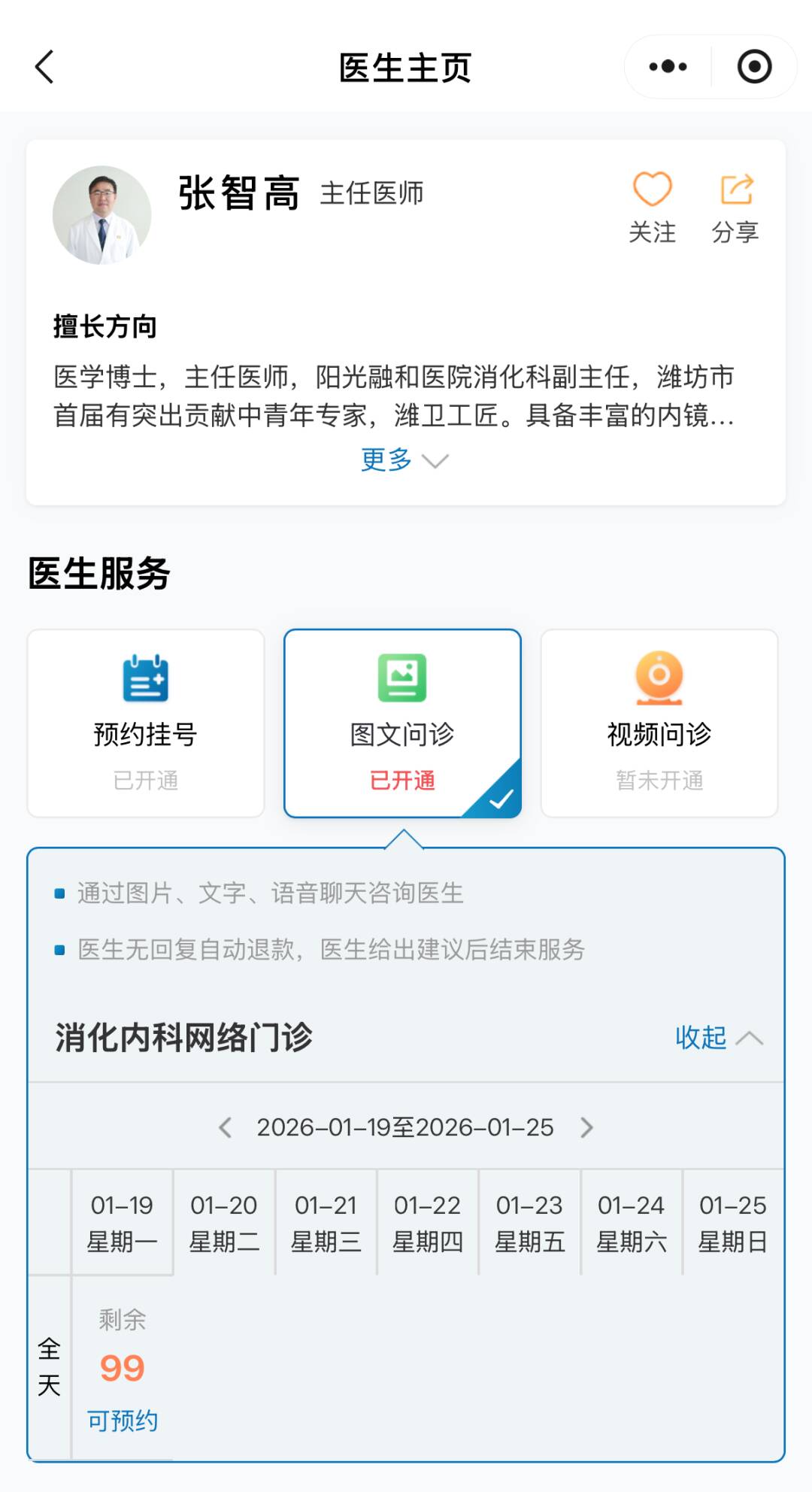 +進(jìn)入醫(yī)生主頁(yè)后,點(diǎn)擊圖文問(wèn)診,等待醫(yī)生接診開方
